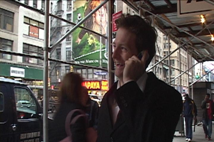 Early in Preston Miller's tough, formally elegant, micro-budgeted Jones, the camera, a la Antonioni, tracks the alienated protagonist, a no longer young but hardly middle-aged father-to-be from South Carolina, as he walks along Broadway near Times Square. That Miller stole the three-block-long shot from a moving car without once having stop for traffic or red lights proves that he's either lucky or ingenious or both. The eponymous Jones (Trey Albright) is in New York on a business trip: he videotapes depositions for an insurance company. At night, he does all the things lonely tourists are programmed to do- drinks himself blotto, talks to strangers in bars, gets lost on the subway, telephones his wife, and summons an Asian call-girl to his dreary hotel room. But just when you think you have Jones's number, he surprises you by, say, expressing a passion for the Japanese writer Haruki Murakami or taking a taxi to Queens to further explore his libidinal leanings towards all things Asian. Jones is a find.